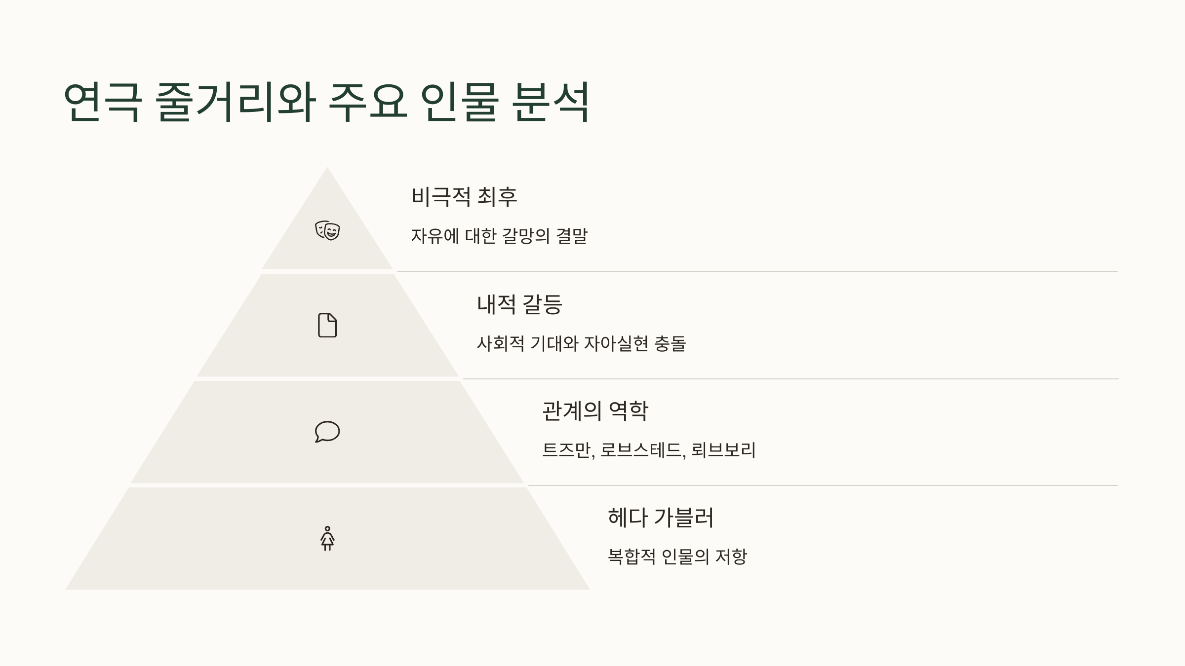 ํค๋ค ๊ฐ๋ธ๋ฌ๋ ์ฐ๊ทน์ ํต์ฌ ํค์๋์ธ ‘์๊ธฐ ํต์ ’์ ‘ํด๋ฐฉ ์๋ง’์ ๊ฐ์ฅ ์์ง์ ์ผ๋ก ๋ด๊ณ ์๋ ์ธ๋ฌผ์ ๋๋ค. ๊ทธ๋ ๋ ์ธ์ ์ผ๋ก๋ ๊ท์กฑ ์ถ์ ์ ์ฐ์ํ ์ฌ์ฑ์ด์ง๋ง, ๋ด๋ฉด์ ํต์ ํ ์ ์๋ ๊ณตํํจ๊ณผ ์ง๋ฃจํจ, ๊ทธ๋ฆฌ๊ณ ์์ ์คํ์ ์ข์ ๋ก ๊ฐ๋ ์ฐจ ์์ฃ . ์ด๋ฐ ๊ฐ์ ์ด ๋ค๋ฅธ ์ธ๋ฌผ๋ค์ ์กฐ์ข ํ๋ ค๋ ์๋ง์ผ๋ก ํ์ถ๋ฉ๋๋ค. ํนํ ๋ขฐ๋ธ๋ณด๋ฅด๊ทธ์ ํ ์ ์ฌ์ด๋ฅผ ์ด๊ฐ์งํ๊ฑฐ๋, ๊ทธ์ ์๊ณ ๋ฅผ ๋ถํ์ฐ๋ ํ๋์์ ํค๋ค์ ๊ฐ์ ์ ์ ์ ์ ์ ์ด๋ฆ ๋๋ค.