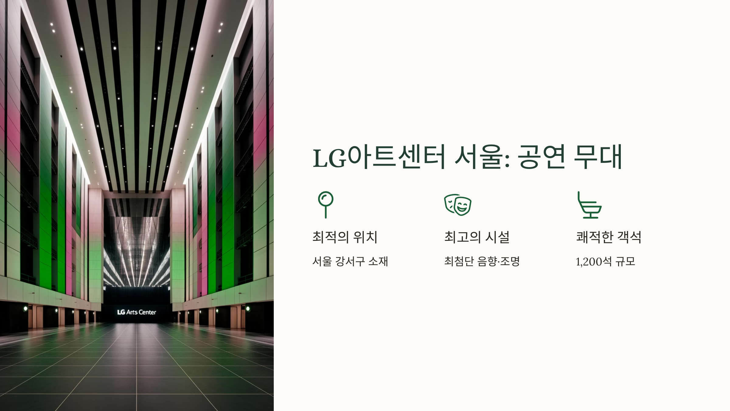 LG์ํธ์ผํฐ ์์ธ์ ์ฝ 1,300์ ๊ท๋ชจ๋ก, ๋ชจ๋ ์ข์์์ ๋ฌด๋๋ฅผ ์ ๋ช ํ๊ฒ ๋ณผ ์ ์๋ ๊ตฌ์กฐ์ ๋๋ค. ๋ฌด๋์ ๊ด๊ฐ ๊ฐ์ ๊ฑฐ๋ฆฌ๊ฐ ๊ฐ๊น์ ๋ฐฐ์ฐ์ ํ์ ๊ณผ ๊ฐ์ ์ ์์ํ ์ ๋ฌ๋ฐ์ ์ ์์ด ์ฐ๊ทน ํฌ๋ค์๊ฒ ๋งค์ฐ ์ธ๊ธฐ ์๋ ๊ณต์ฐ์ฅ์ ๋๋ค. ๐ญ