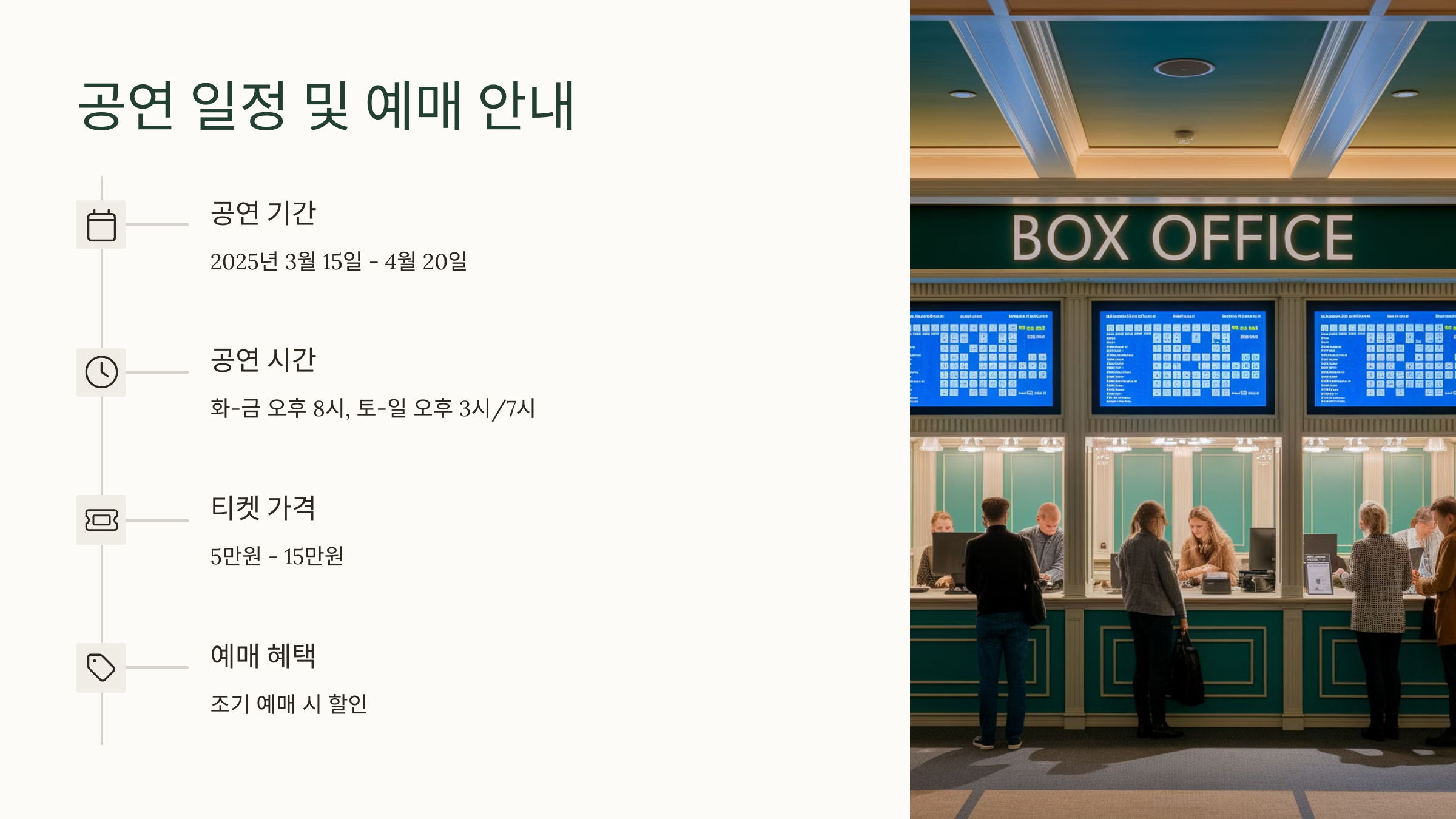 | ๊ณต์ฐ ์ผ์ | 2025๋ 6์ 10์ผ ~ 7์ 20์ผ, ํ์ผ/์ฃผ๋ง 1~2ํ ๊ณต์ฐ |